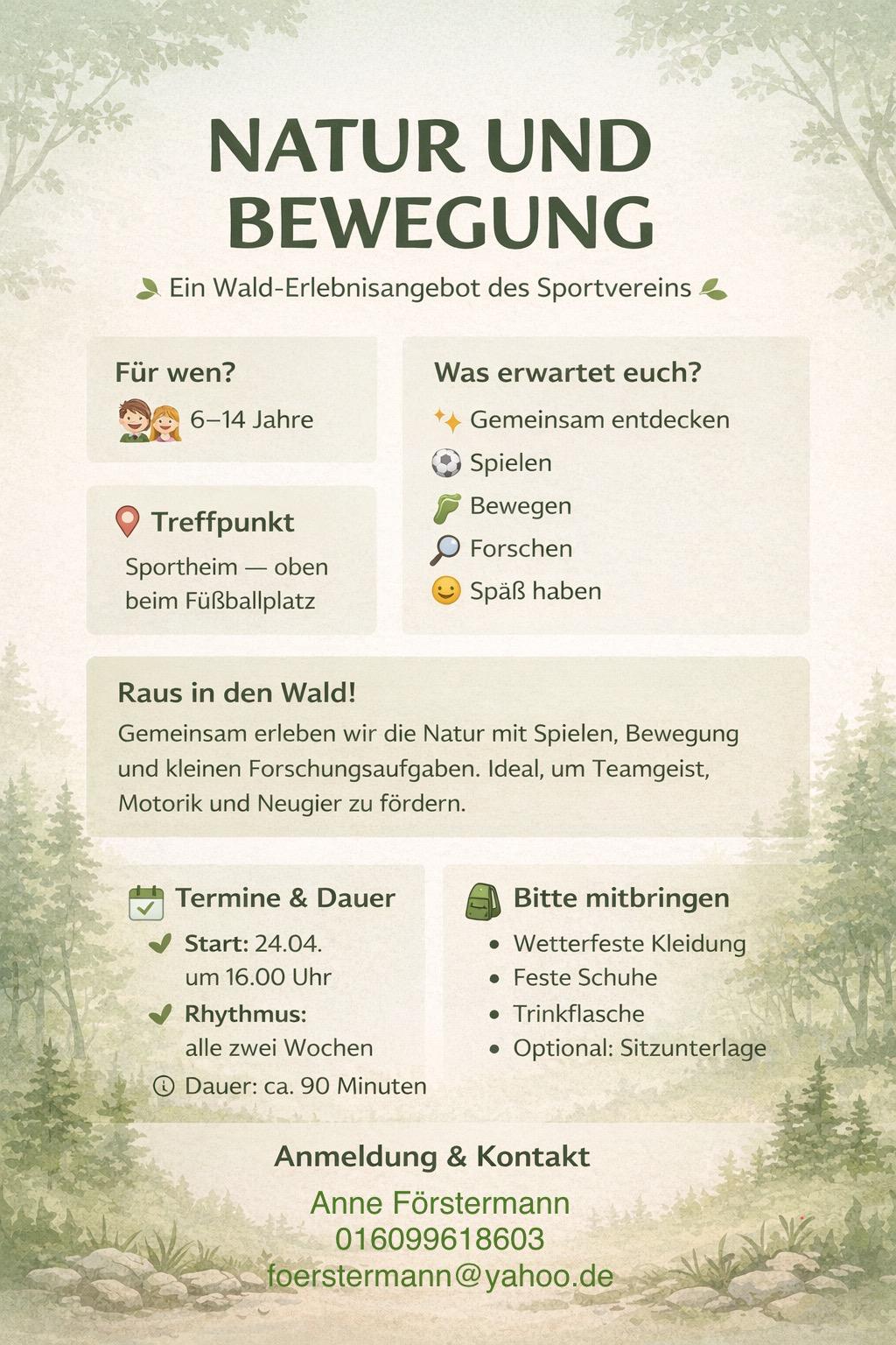 Jeden zweiten Freitag um 16 Uhr treffen wir uns am Sporthaus (erstes Treffen ist am 24.04.2026). Weitere Infos siehe Flyer.